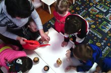 Рус халык аваз иҗаты белән танышу атналыгы бара. Балалар белән бергә русча шигырьләр, уеннар өйрәнәбез.Рус фольклоры белән танышабыз. Бакчада интернациональ- патриотик тәрбия эше даими алып барыла. Балалар рус халык орнаментларын күздә тотып "Матрешкалар" бизиләр.