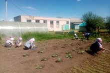 Мәктәп бакчасында эш дәвам итә. Укытучылар, хезмәткәрләр белән берлектә укучылар да тырышып эшлиләр.