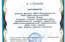 Дипломом 2 степени награждается ученица филиала МБОУ "Утар-Атынская ООШ" "Субаш-Атынская НОШ" Самиева Илюза, занявшая 2 место на районном этапе республиканского конкурса творческих работ антикоррупционной направленности "Надо жить честно" (руководитель Вафина Гульгена Аминовна)