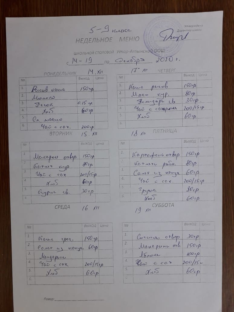 Недельное меню с 14 по 19 сентября 2020 2020 5-9 классы