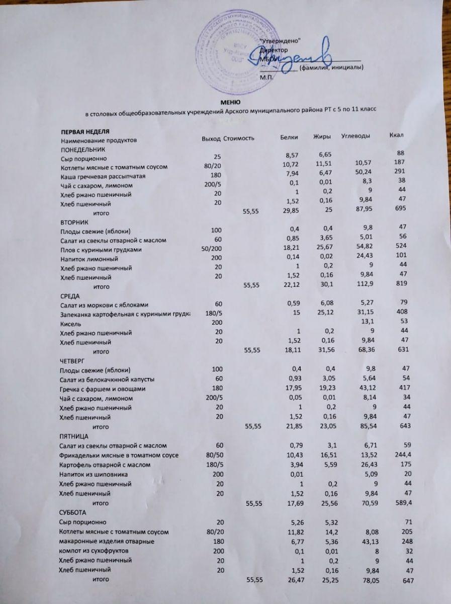 меню 5-9 классы 1 неделя 2 неделя