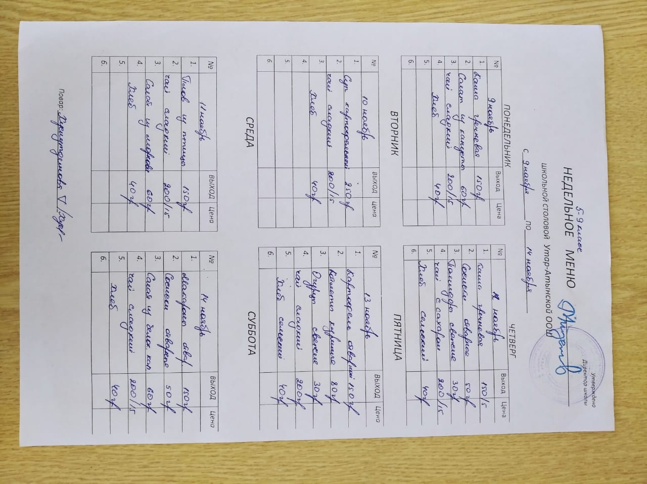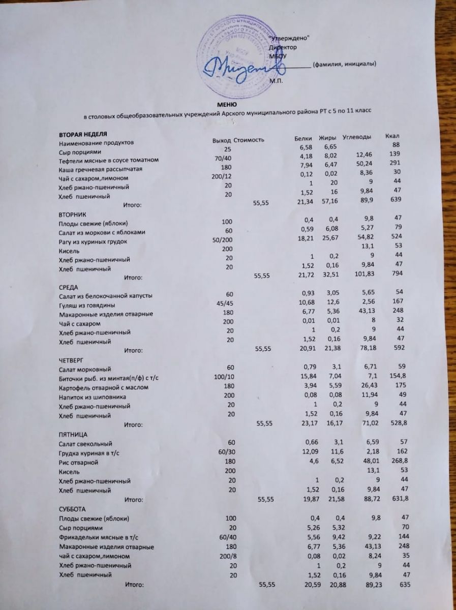 Недельное меню с 9 по 14 ноября 2020 5-9 классы