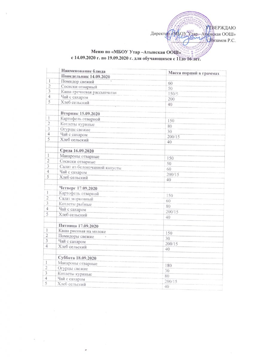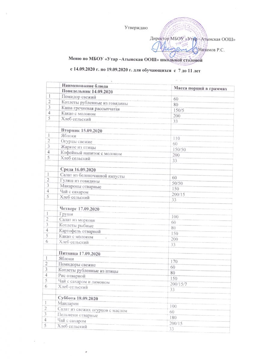 Недельное меню с 14 по 19 сентября 2020 2020 1-4 классы