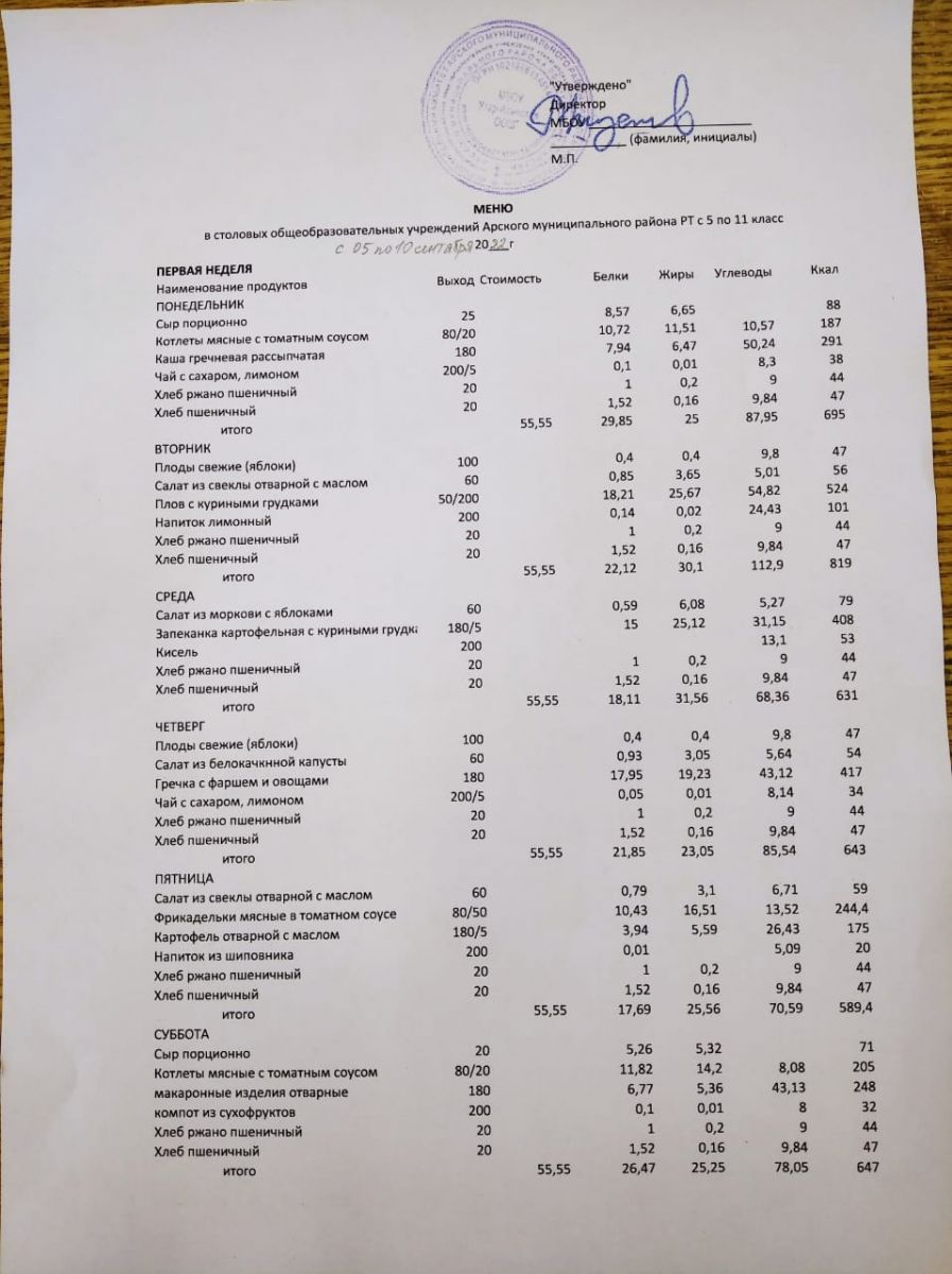 - на основании Постановления 724 от 11.08.2022г. Питание исполнительного комитета Арского муниципального района РТ для семей, имеющих в своем составе 4 и более детей, детей-сирот и детей, оставшихся без попечения родителей, детей с ограниченными возможностями здоровья, организовать бесплатное горячее питание за счет республиканской субсидии в размере 55 руб. 55 коп. за счет средств местного бюджета.