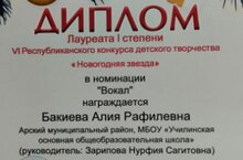 «Новогодняя звезда»конкурсында Расих һәм Алия Бакиевлар,Абдрахманова Камилә 1 урынга лаек булдылар.Котлыйбыз, балалар!Киләчәктә дә уңышлар телибез! -