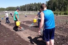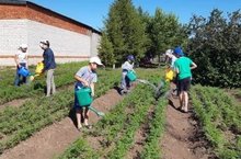 Бакчада эш дәвам итә: вакытында чүбен утап, суын сибеп торсаң гына бакча матур буласын укучылар бик яхшы анлыйлар. Шуна да тырышып, матур һәм мул уңыш булсын, дип эшлиләр.