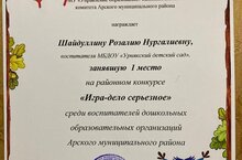 В районном конкурсе "Игра - дело серьезное" среди педагогов ДОУ Арского района наш сотрудник занял 1 место. Поздравляю!!!