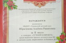 Наш воспитатель участвовала в конкурсе "Лучший ковробук" среди педагогов Арского детского сада №8 и детских садов, закрепленных за базовым ДОУ, и была награждена грамотой за II место. Поздравляем!