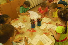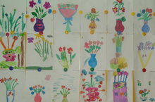 На занятии по рисованию воспитанники старшей группы учились передавать колорит весеннего букета, самостоятельно формировать композицию рисунка; закрепили знания цветов и умения аккуратного пользования гуашью.