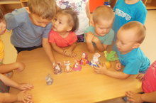 На занятии по лепке воспитанники младшей группы закрепили умение лепить знакомые предметы, использовать знакомые приемы: раскатывания пластилина прямыми и кругообразными движениями, сплющивания ладонями.