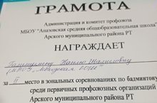 17 декабря члены профсоюза нашей школы достойно выступили в Первенстве Арского муниципального района по бадминтону и настольному теннису на базе МБОУ «Апазовская СОШ». В результате упорной борьбы в соревнованиях Галимуллина Н.Ш. заняла 2 место по бадминтону, Гарипова А.Д. – 2 место по настольному теннису. Поздравляем!