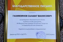 22-24 декабря в Казани состоялся Форум юных граждан Татарстана. Форум направлен на поддержку детских инициатив, развитие общественной деятельности в РТ, содействие и помощь детским общественным объединениям, а также выявление и решение детских и молодежных проблем. Отличительной особенностью в этом году для всех желающих стала образовательная онлайн-программа. Работа Форума была организована по 9 основным направлениям: медиа, ЗОЖ, цифровые технологии, волонтерство, образование и правовая защита детей и молодежи, детское движение, патриотическое воспитание, экология, культура и творческое развитие подростков. В работе Форума принял участие и активист нашей школы Галимзянов Салават, обучающийся 11 класса. По итогам Форума Салават за проведение образовательного блока награжден Благодарственным письмом Региональной общественной организации «СДО Республики Татарстан».