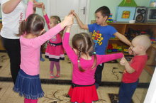 Балалар парлашып бер-бер артлы тезелешеп басалар. Бер бала аларга йөзе белән карап баса. Барысы бергә: