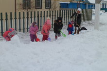 Балалар белән саф һавага чыккач сукмакны кардан бик теләп чистартабыз.