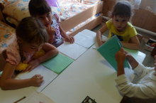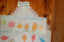 Балалар белән трафарет ярдәмендә яфраклар төшереп буядык, балалар эшләрен бик тырышып башкардылар.