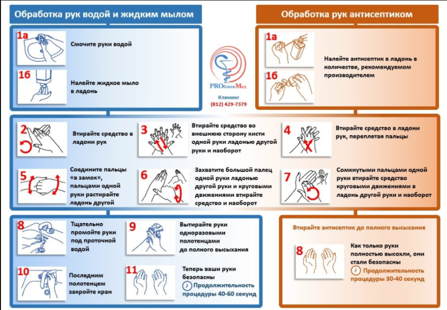 Памятка по обработке рук антисептиком, водой и жидким мылом.
