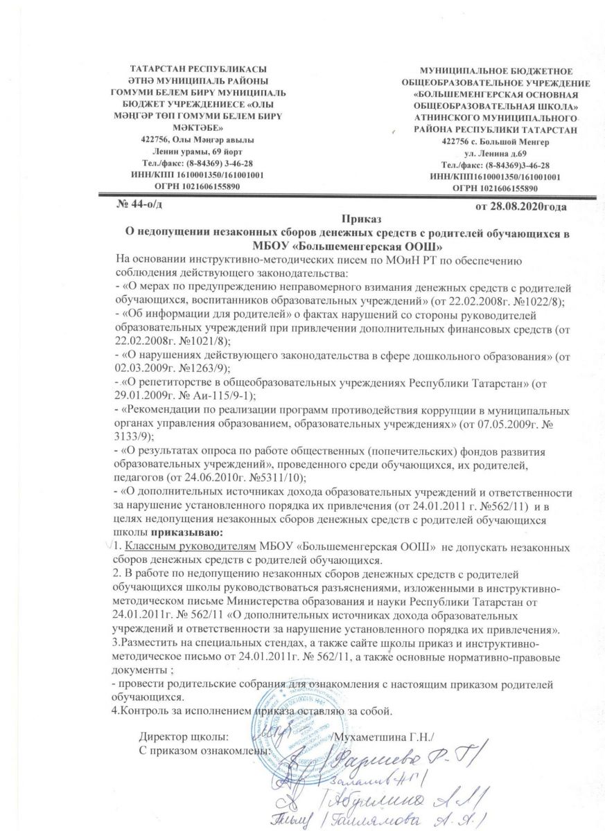 Приказ о недопущении незаконных сборов денежных средств с родителей