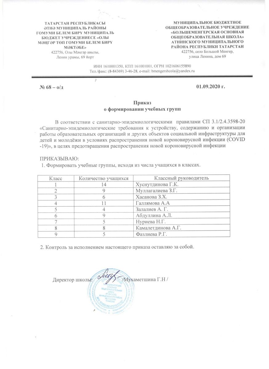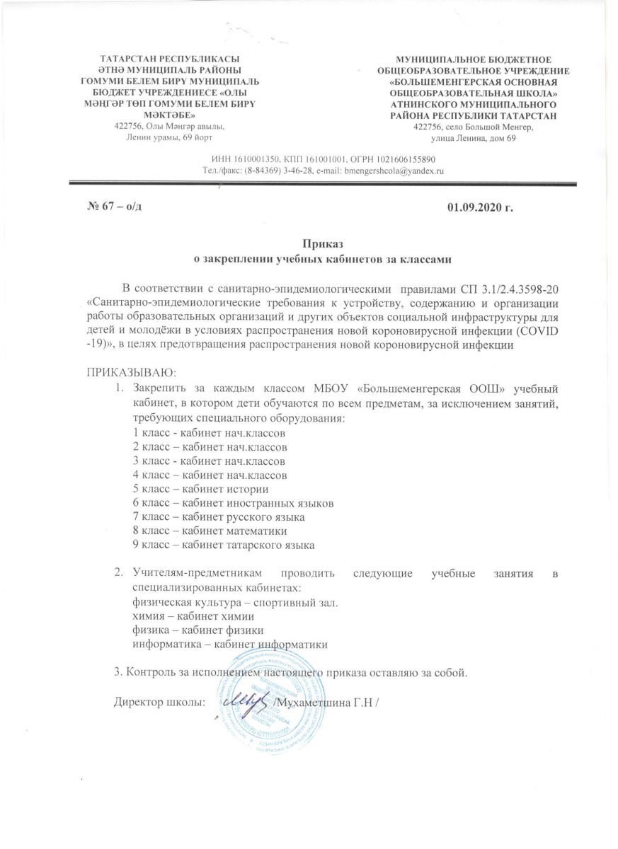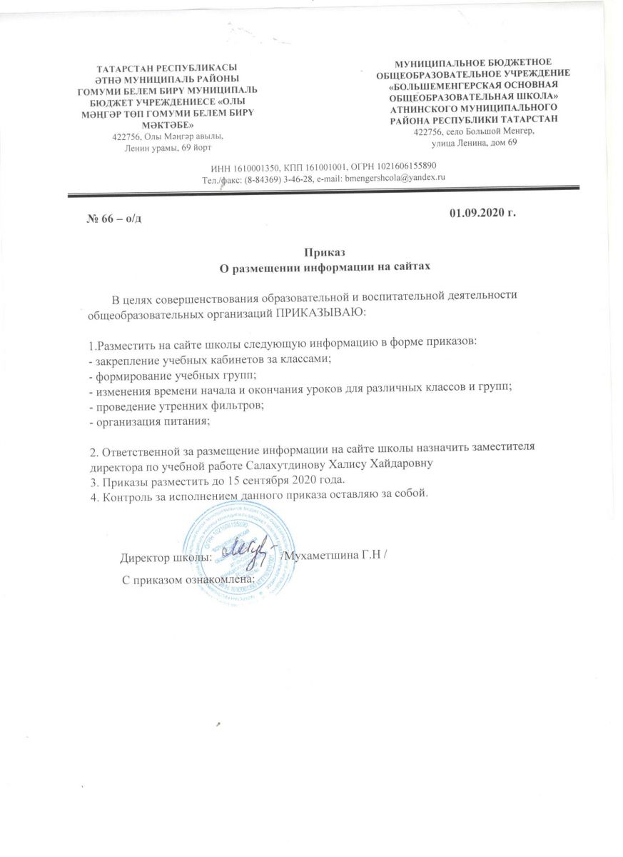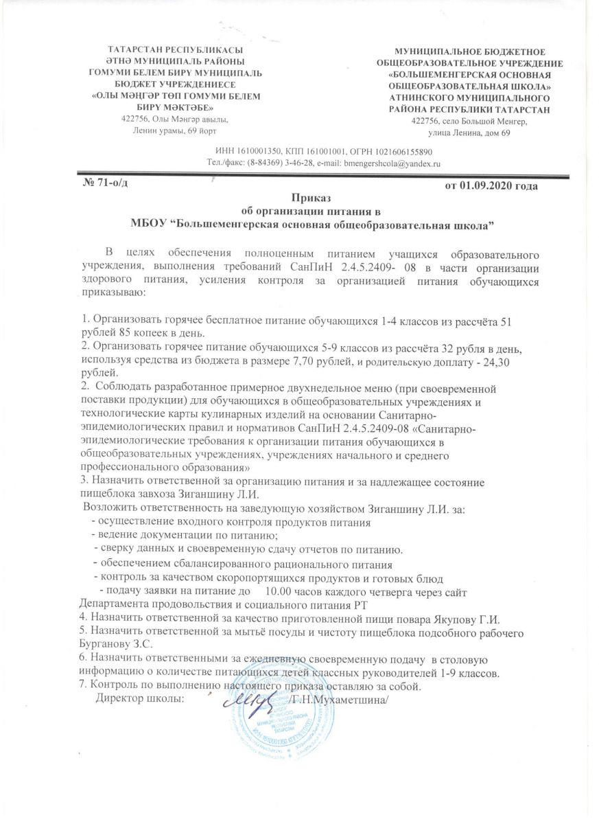 Приказ об организации питания в МБОУ “Большеменгерская основная общеобразовательная школа”