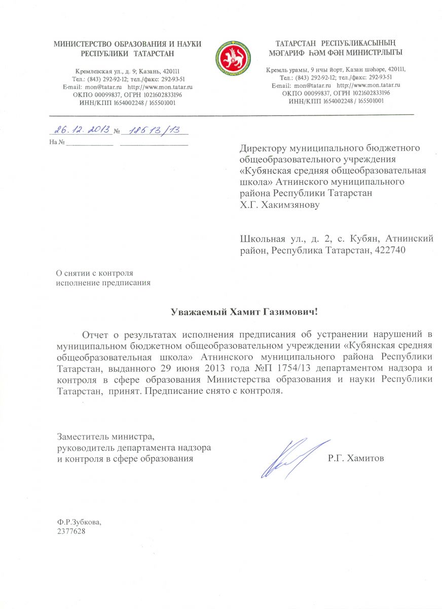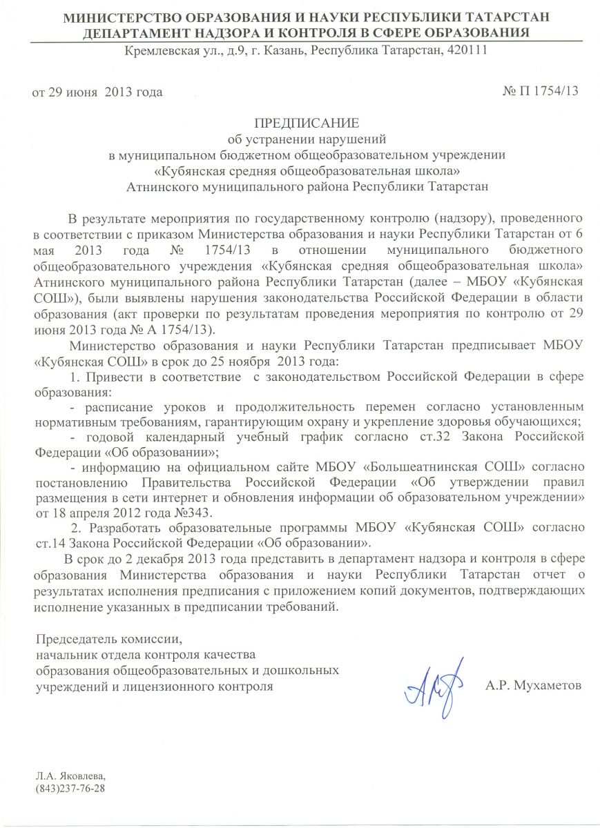 Предписание об устранении нарушений в МБОУ "Кубянская СОШ" Атнинского муниципального района РТ