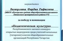 Башлангыч сыйныф укытучыларының республикакүләм видеодәресләр конкурсында Вәлиуллина Ф.Р. “Педагогическая культура” номинациясендә җиңү яулады 08.01.2016