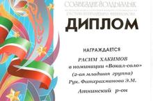 Түбән Көек урта гомуми белем бирү мәктәбенең 4 нче сыйныф укучысы Хәкимов Рәсим, «Вокал-соло» номинациясендә катнашып, диплом белән бүләкләнде.