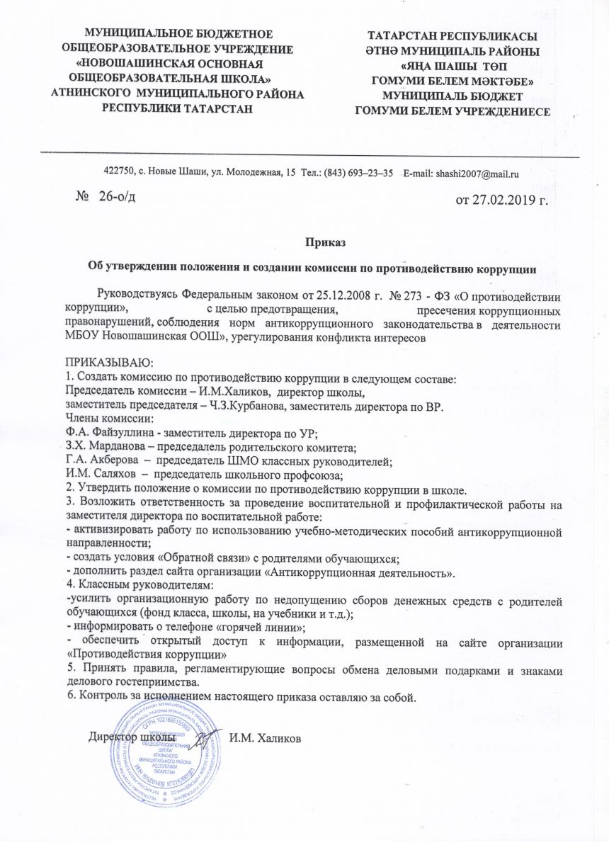 - Приказ МБОУ "Новошашинская ООШ" " Об утверждении положения и создании комиссии по противодействию коррупции"