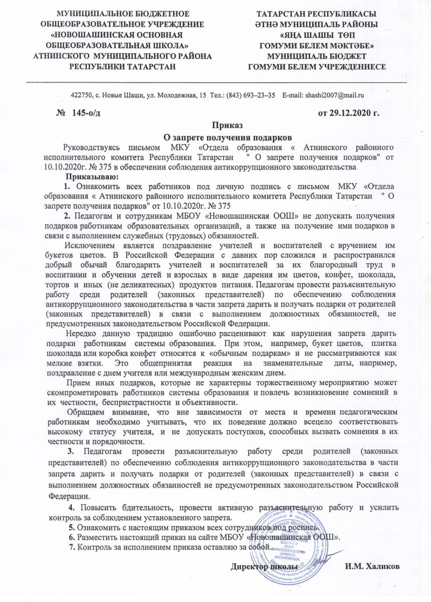 - Приказ МБОУ "Новошашинская ООШ" "О запрете получения подарков"
