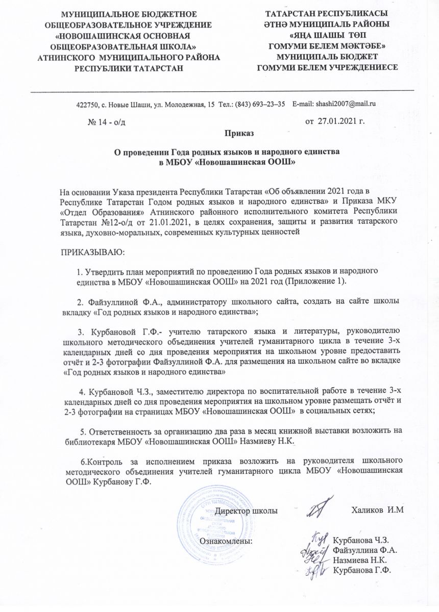 Приказ МБОУ "Новошашинская ООШ" О проведении Года родных языков и народного единства