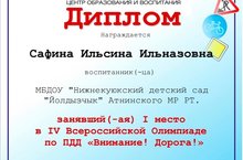 IV Всероссийская Олимпиада по ПДД "Внимание! Дорога!" Наша воспитанница -Сафина Ильсина заняла 1 место./Сафина Илсинә IV Всероссийская Олимпиада по ПДД "Внимание! Дорога!" олимпиадасында 1 урынга лаек булды.