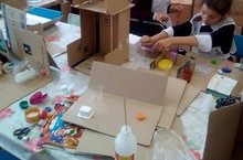В объединении "Поделки из бросовых материалов" учащиеся выполняют проектную работу из картонных коробок.