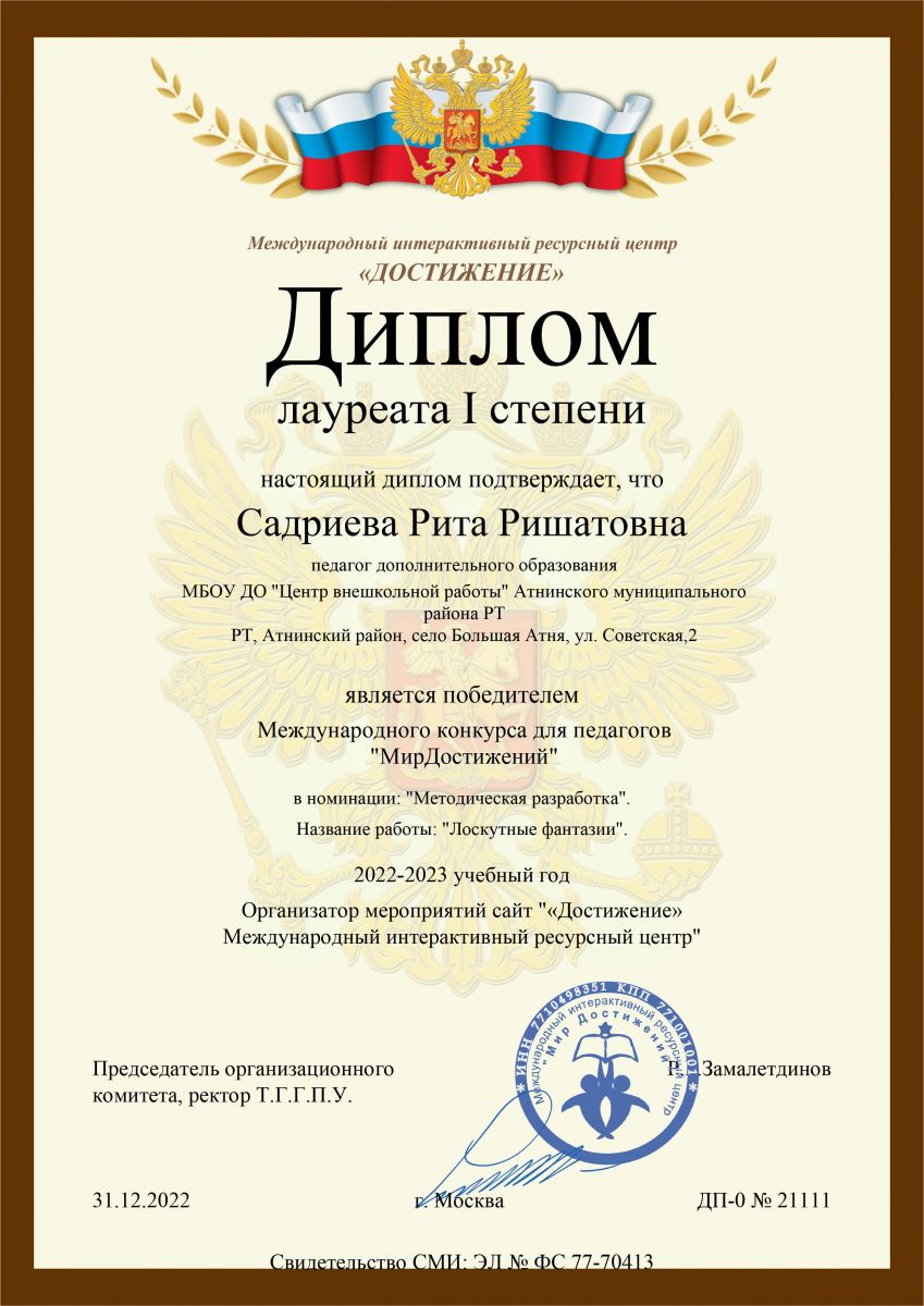 Диплом лауреата I степени - Международный конкурс для педагогов "МирДостижений"
