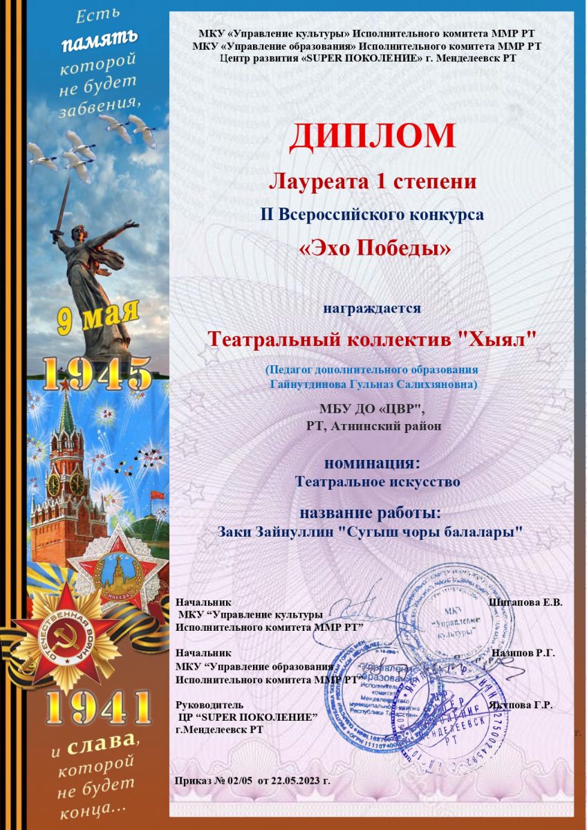Диплом лауреата I степени - II Всероссийского конкурса "Эхо Победы"