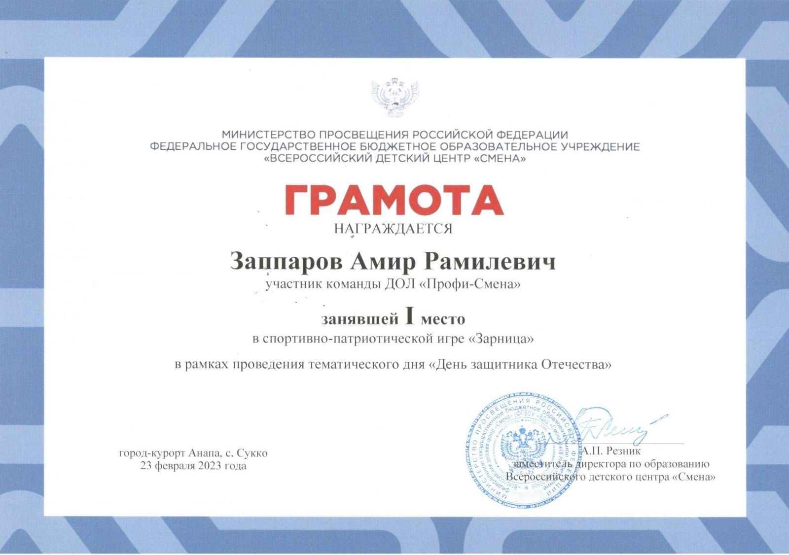 Грамота 1 место - Всероссийская спортивно-патриотическая игра «Зарница»