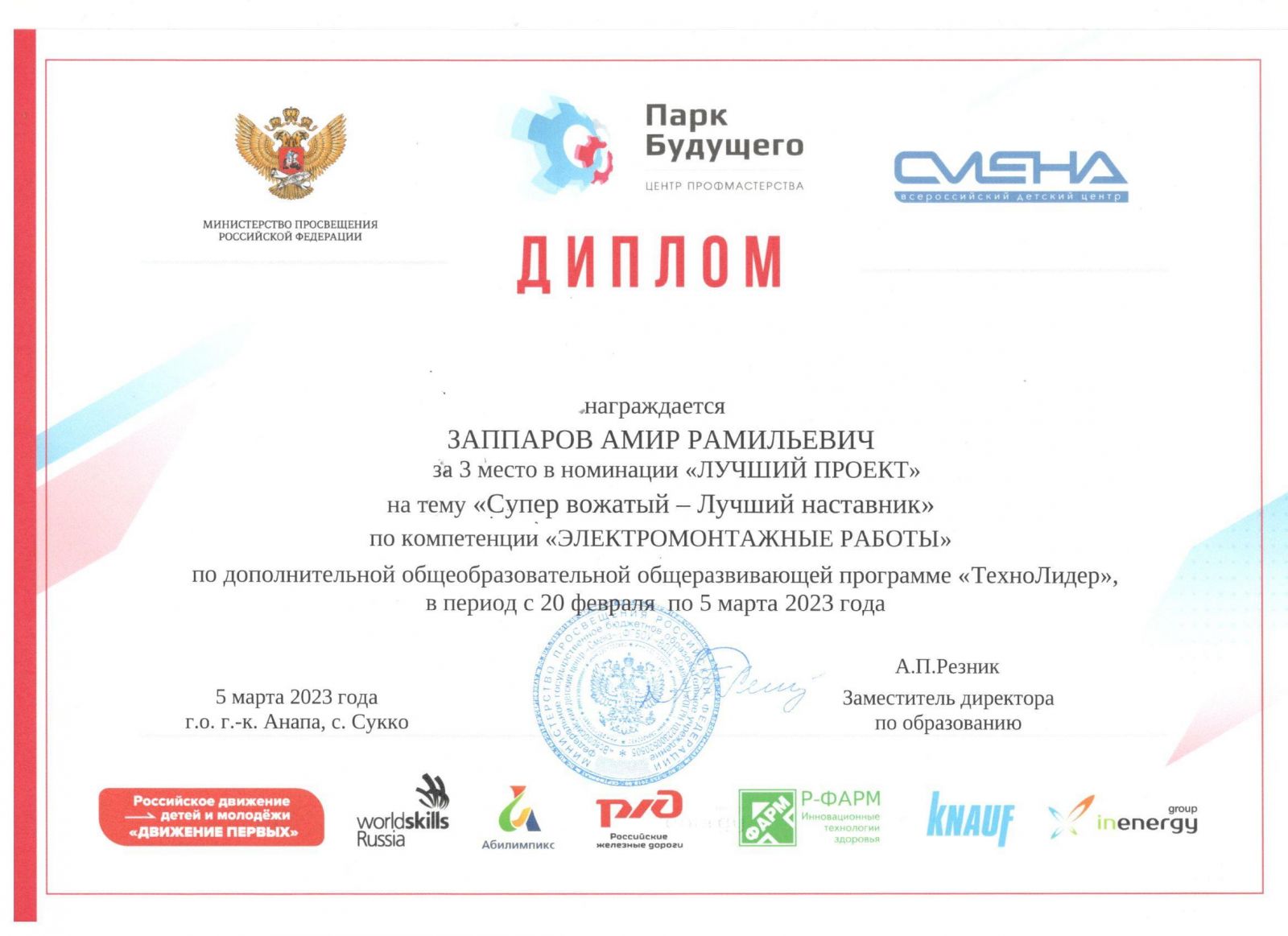 Диплом за 3 место - в смене Всероссийского детского центра , в номинации "Лучший проект"