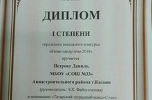Поздравляем победителей городского конкурса "Казан сандугачы" Петрова Данила - 2 А класс, Юнусову Малику- 5 А класс, Петрову Динару- 7 Л класс.