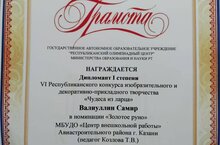 Поздравляем ученика 2 А класса Валиуллина Самира, который занял 1 место в Республиканском конкурсе изобразительного и декоративно-прикладного творчества "Чудеса из ларца" в номинации "Золотое руно".