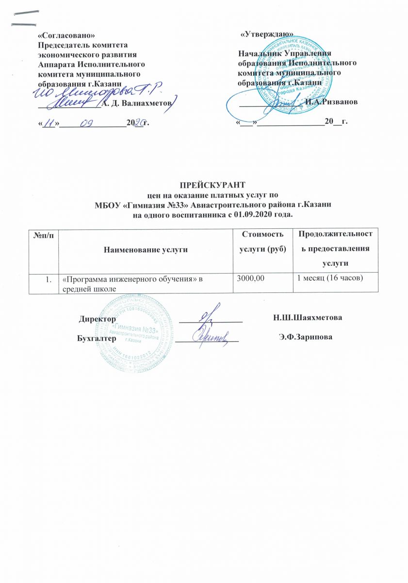 Прейскурант цен на оказание платных услуг на 2020/2021 уч.год