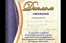 Поздравляем с успешным выступлением и Дипломом II степени Долгих Романа, ученика 9А класса и Смирнову Анну, ученицу 11класса, с Дипломом III степени.