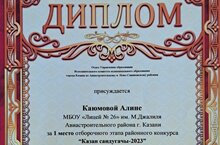Ученица 10 класса Каюмова Алина заняла первое место отборочного этапа районного конкурса "Казан сандугачы-2023", Руководитель: Тимергалеев Нияз Бадретдинович.