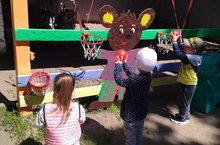 Воспитатели нашего детского сад на прогулке обучают детей элементам спортивных игр. Для того чтобы хорошо играть в баскетбол, необходимо уметь правильно бросать мяч. В сущности, баскетбол довольно простая игра: необходимо всего лишь попасть мячом в кольцо с сеткой, называемое корзиной. У малышей это получается.