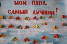 Каждый ребёнок в нашем детском саду ко Дню Защитника Отечества приготовил для папы подарок. А дети подготовительной группы оформили ещё и стенгазету вот с такими парашютами. А под каждым парашютиком - пожелание для папы к празднику.