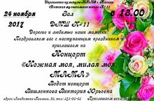 Праздничный концерт для любимых мам состоялся 24 ноября в ДМШ11. Самые лучшие и проникновенные стихи о маме подготовила ведущая концерта Виктория Юрьевна Вишленкова, а юные музыканты с большим мастерством и вдохновением исполнили свои концертные номера. Благодарим всех исполнителей, концертмейстеров и преподавателей за прекрасный концерт!!! Поздравляем всех мам с наступающим Праздником и желаем Вам ласковых улыбок, любви и заботы, радости и гордости за своих детей!