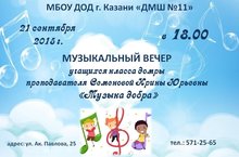 21 сентября в 18.00 приглашаем вас посетить музыкальный вечер учащихся класса домры преподавателя Семеновой Ирины Юрьевны "Музыка добра"