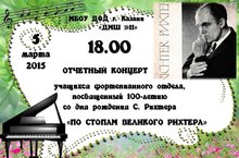 20 марта 2015 года исполняется 100 лет со дня рождения выдающегося пианиста современности Святослава Рихтера. Этой знаменательной дате был посвящен отчетный концерт учащихся фортепианного отдела "По стопам великого Рихтера", который состоялся 5 марта в концертном зале Детской музыкальной школы.