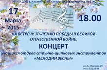 28 февраля 2015 года в 17.00 в ДМШ №1 им. П.И. Чайковского состоялся отчетный концерт учащихся – пианистов ДМШ системы культуры «По волнам памяти», посвященный 70-летию ВОВ, году литературы в РТ и юбилейным датам.