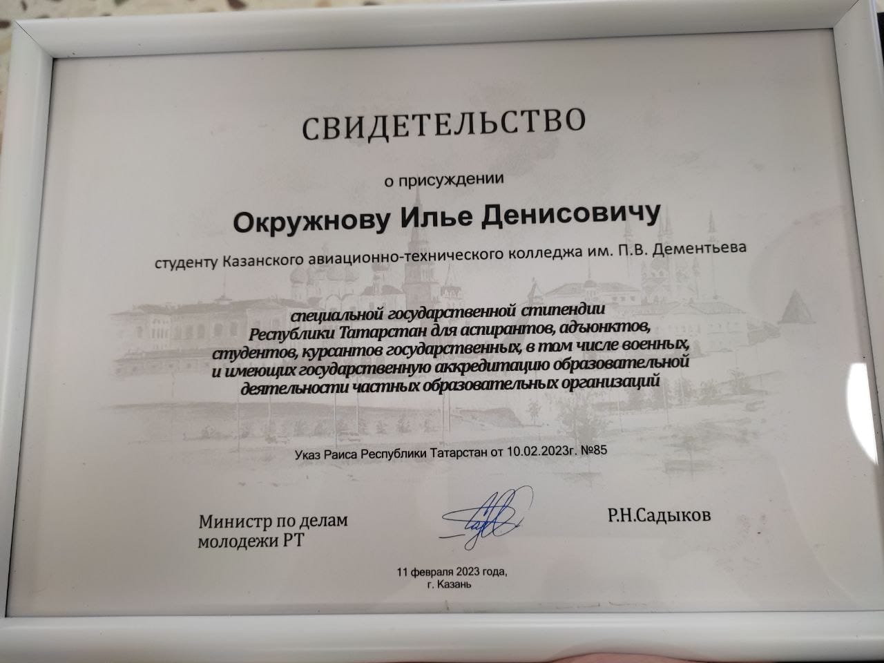 Обладателями специальных государственных стипендий стали 22 аспиранта и адъюнкта, 48 курсантов и студентов образовательных организаций высшего образования, 20 студентов организаций профессионального образования. Среди них оказался и студент нашего колледжа группы 20Т2 Илья Окружнов. Ох, завидуем КАЗ им.С.П Горбунова- филиал ПАО «Туполев», ведь Илья является «целевиком» и будущим специалистом предприятия. Ну, а пока, он учится и работает в качестве лаборанта в колледже, и справляется с этим на все.