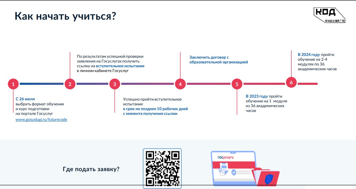 Опубликовано: 08.08.2023В рамках проекта «Код будущего» федерального проекта «Развитие кадрового потенциала ИТ-отрасли» национальной программы «Цифровая экономика Российской Федерации» обучающимся по образовательным программам основного общего и среднего общего образования с 8 по 11 класс, а также обучающимся по программам среднего профессионального образования предоставлена возможность бесплатно пройти двухлетний курс обучения современным языкам программирования. Набор участников проекта «Код будущего» на 2023 – 2024 учебный год стартовал 26 июля 2023 г. на Едином портале государственных и муниципальных услуг (функций) (ЕПГУ).