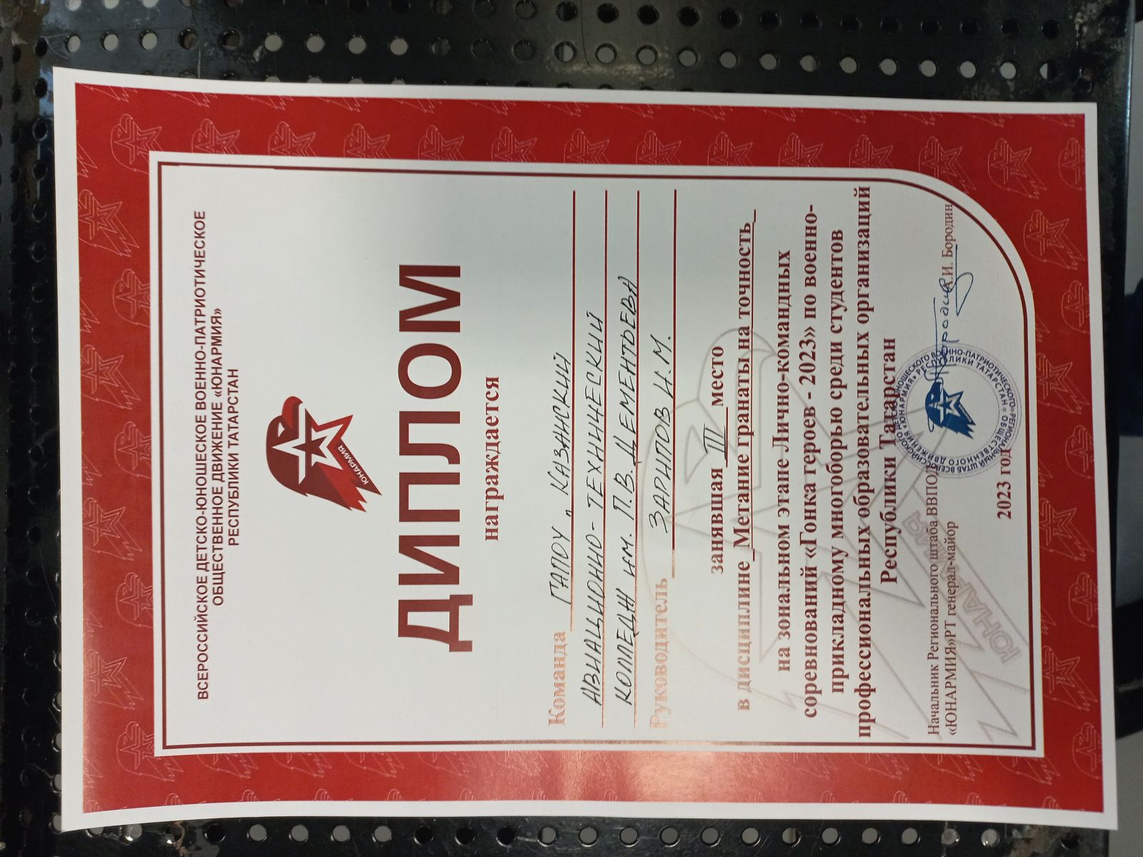 Опубликовано: 04.11.2023В рамках Всероссийского физкультурно-спортивного комплекса «Готов к труду и обороне» (ГТО) в Республике Татарстан 04.11.2023 команда нашего колледжа на зональном этапе Лично-командных соревнований «Гонка героев – 2023» по военно-прикладному многоборью среди студентов профессиональных образовательных организаций Республики Татарстан, заняли 3 место в дисциплине Метание гранаты на точность.