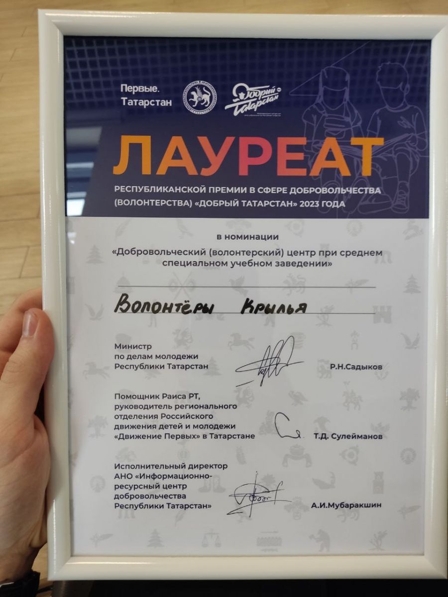 Также на съезде прошел очный этап Республиканской премии в сфере добровольчества «Добрый Татарстан". Наш добровольческий отряд "Волонтёры Крылья" стал лауреатом в номинации "Добровольческий (волонтёрский) центр при среднем специальном учебном заведении".