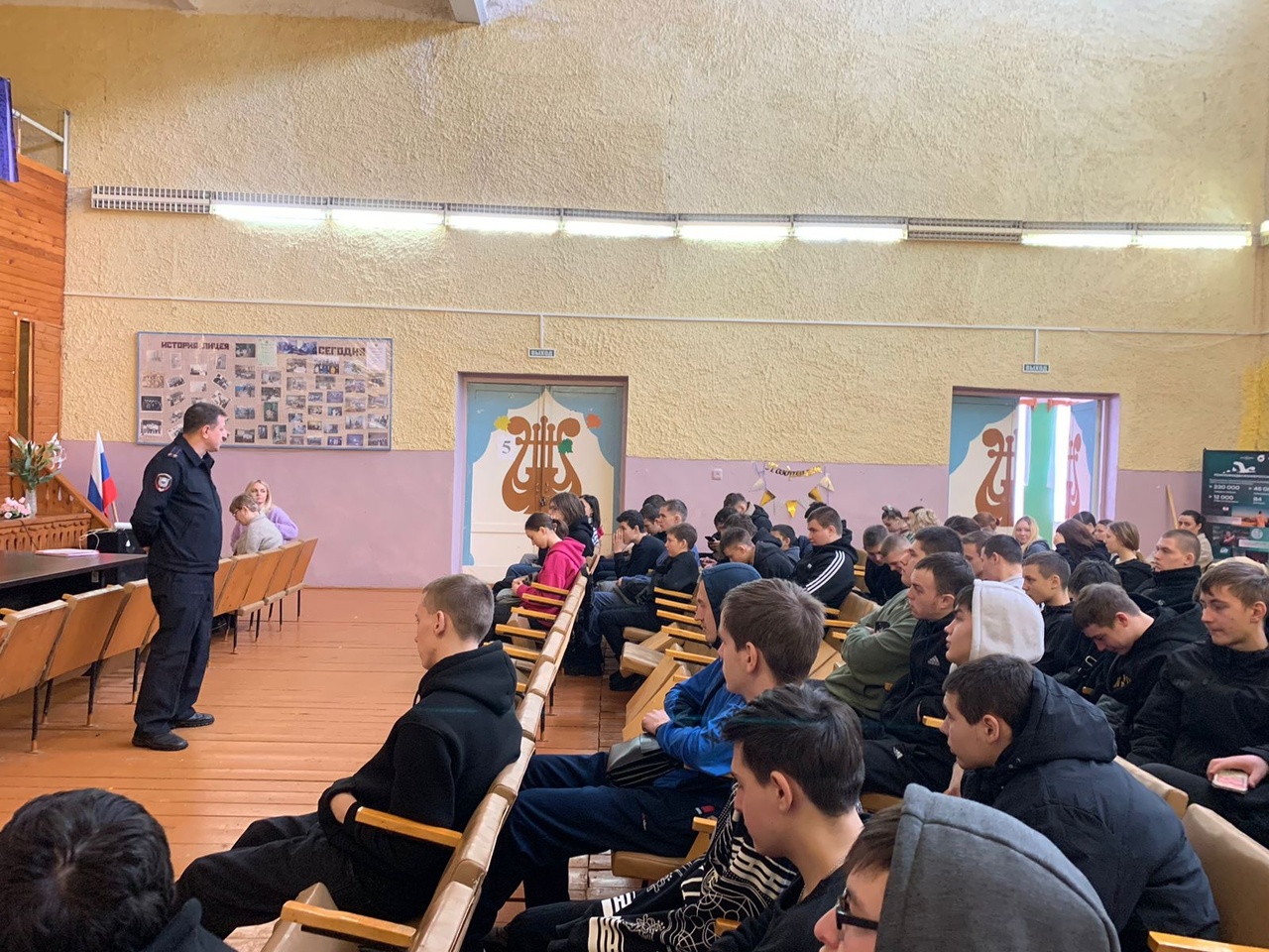 Инспектор ПДН Зайнуллина З.Р. рассказала об ответственности за совершение административных правонарушений и преступлений. Ребятам были вручены памятки о правилах поступления в Елабужское военное суворовское училище и Казанский юридический институт. В мероприятии приняли участие 95 человек. Сотрудники полиции ответили на вопросы студентов.